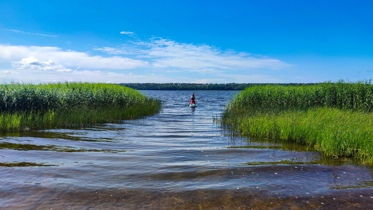 На фотографии изображён человек, плывущий на сапборде по озеру между густыми зарослями камыша. На горизонте видна лесная полоса, а над водой — голубое небо с лёгкой облачностью. Вода отражает небо и зелень прибрежных растений. Снимок передаёт атмосферу активного отдыха на природе и может использоваться для тематики экотуризма, спорта на воде и летнего досуга.