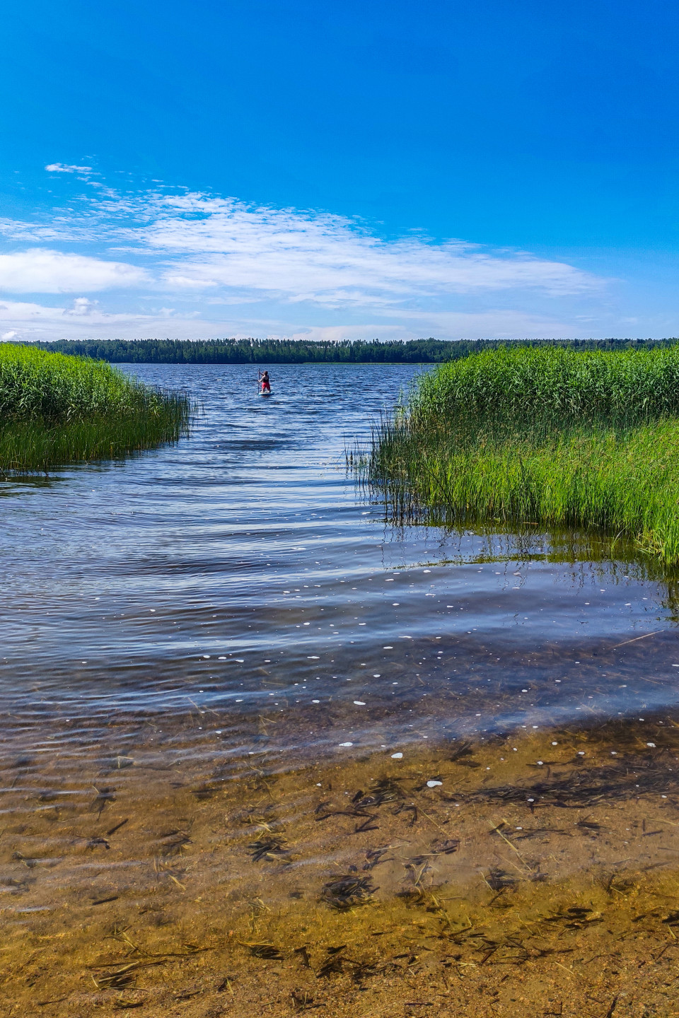 озеро вода отдых лето природа пейзаж сапборд человек берег дно водоросли камыш растения лес горизонт небо облака прозрачная вода спорт активность экотуризм путешествие досуг туризм водные виды спортаПохожие фотографии