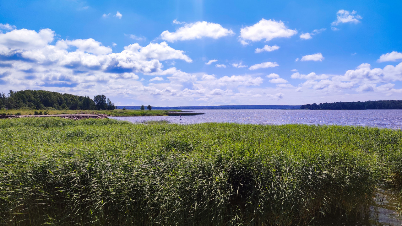 На фото показан обширный водоем с густыми зарослями камыша на переднем плане. Вдалеке можно различить фигуру человека, стоящего на сапборде, движущегося по воде. На горизонте видны лесные массивы, которые создают естественную границу озера. Вода спокойная с блеском от солнечного света, небо украшено легкими облаками. Культурных или исторических объектов нет, это типичный пейзаж средней полосы. Фотография подходит для использования в публикациях о туризме, спорте, экотуризме и отдыхе на природе.