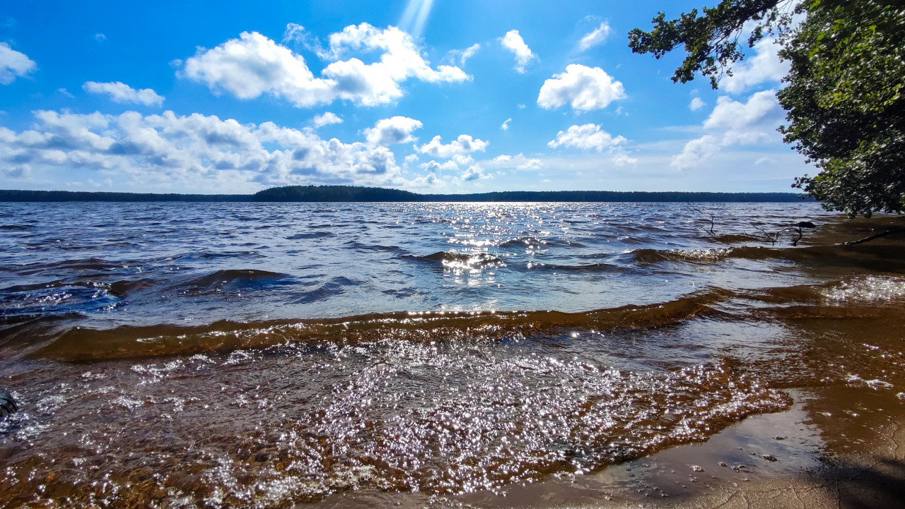 Снимок демонстрирует волну озера, накатывающую на берег, при этом солнечные лучи создают яркие блики на воде. На дальнем плане заметен лесистый горизонт, а небо заполнено кучевыми облаками. На фото нет культурных или архитектурных объектов, изображение посвящено исключительно природному ландшафту. Подходит для использования в материалах о туризме, отдыхе, экологии и природе.