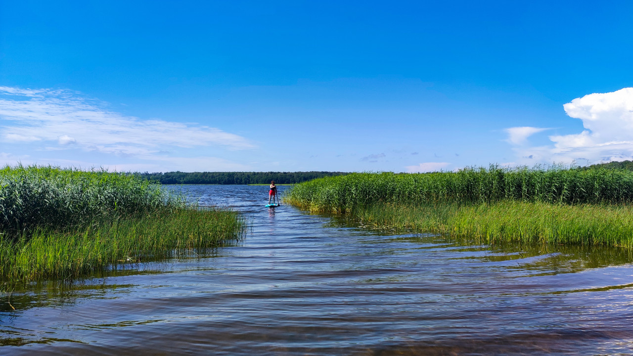 На снимке запечатлена женщина, стоящая на сапборде и двигающаяся по спокойной воде узкого прохода, ограниченного камышами. Вода чистая и слегка колышется, отражая яркое голубое небо. На дальнем плане виднеется лесная полоса. Человек в спортивной одежде демонстрирует популярный вид отдыха — катание на сапборде. Фото передает летнюю атмосферу и рекреационное использование природных ресурсов. Культурных или исторических объектов в кадре нет, поэтому акцент сделан исключительно на взаимодействии человека и природного пейзажа. Снимок подойдет для иллюстраций о водных видах спорта, туризме, здоровом образе жизни и летнем досуге.