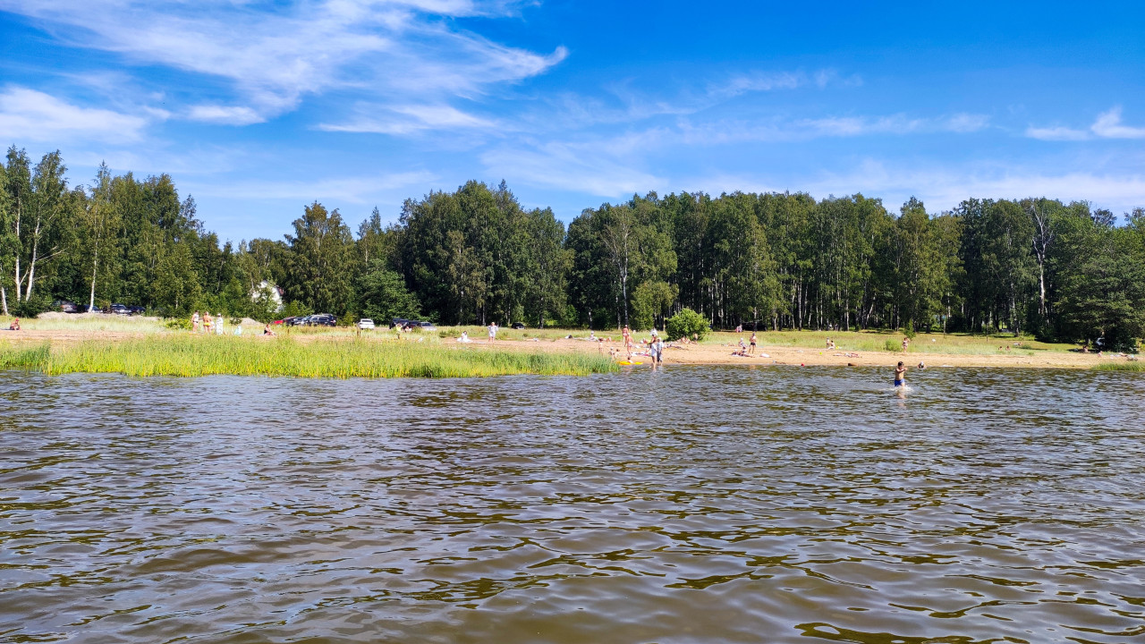 На снимке изображен песчаный пляж у леса, куда приехали люди на автомобилях. На берегу видны отдыхающие, купающиеся в озере и загорающие на песке. Вода спокойная, на переднем плане виден мелководный участок с растительностью. Лесной массив создает фон, небо ясное и голубое. Фотография отражает типичный летний отдых на природе.