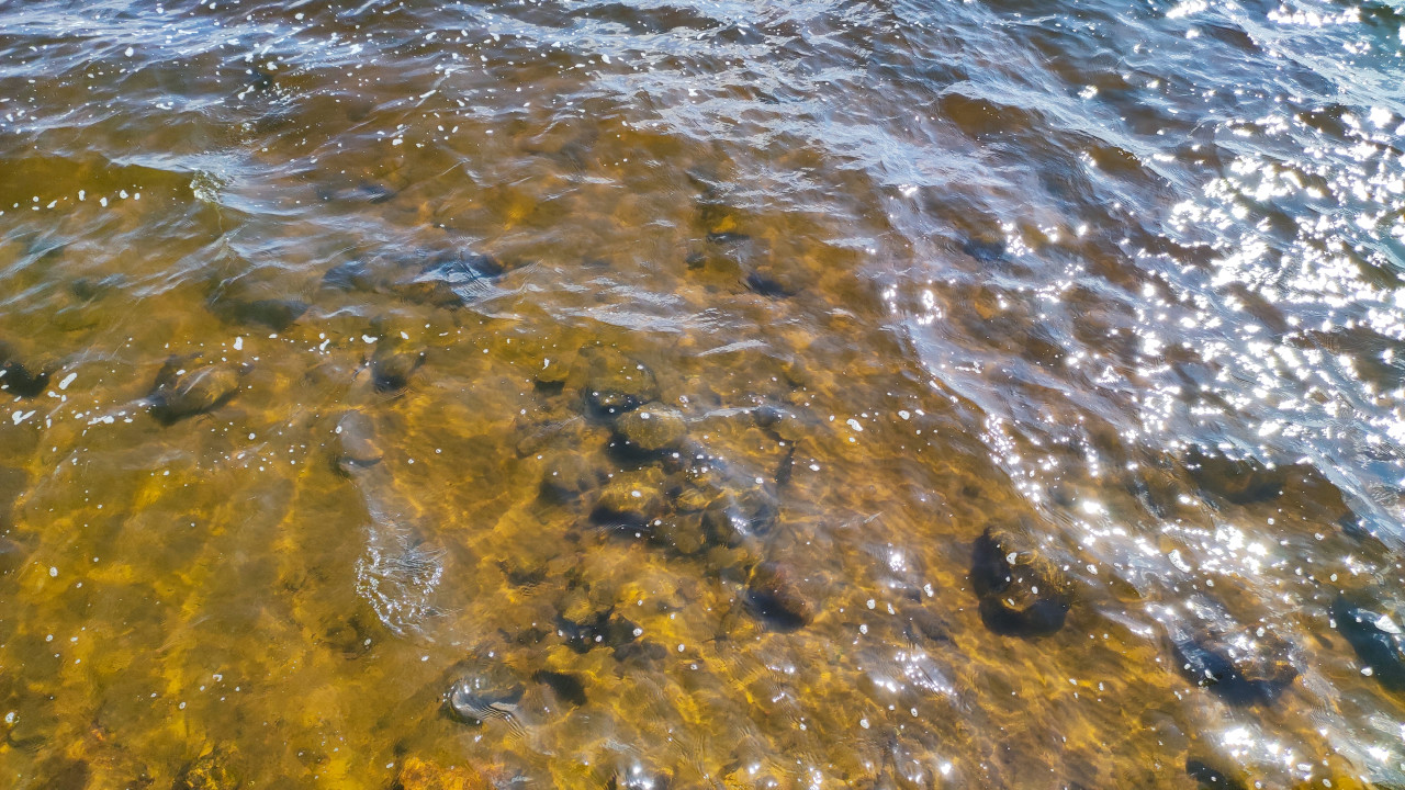 На фото запечатлена прибрежная часть озера с прозрачной водой, через которую отчетливо видны камни на дне. Солнечный свет создает многочисленные блики на поверхности воды. Снимок акцентирует внимание на детали водной экосистемы и прозрачности воды. Культурных или архитектурных объектов в кадре нет. Фотография может быть использована в материалах об экологии, природе, гидрологии и летнем отдыхе у воды.