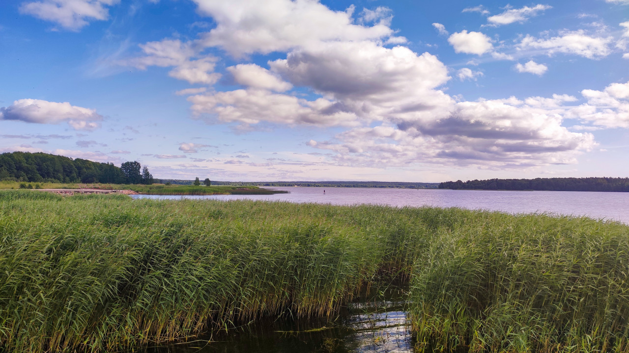 На фото изображён широкий водоём с густыми зарослями тростника на переднем плане. На горизонте видны лесные массивы и небольшая полоса берега. В небе плотные облака перемежаются с просветами, что создаёт игру света и тени на поверхности воды. Вдали можно заметить человека на сапборде. Снимок можно использовать для иллюстрации тематики экологии, отдыха на природе и летних видов спорта.