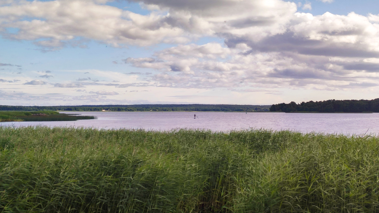 На фотографии показан водоём, где в центре вдали находится человек, стоящий на сапборде. На переднем плане кадра видны густые заросли камыша, а на горизонте — лесной массив. Небо облачное, свет мягкий, подчёркивает спокойную атмосферу пейзажа. Изображение отражает популярный вид отдыха на воде и может быть использовано в материалах о спорте, туризме и экологии.