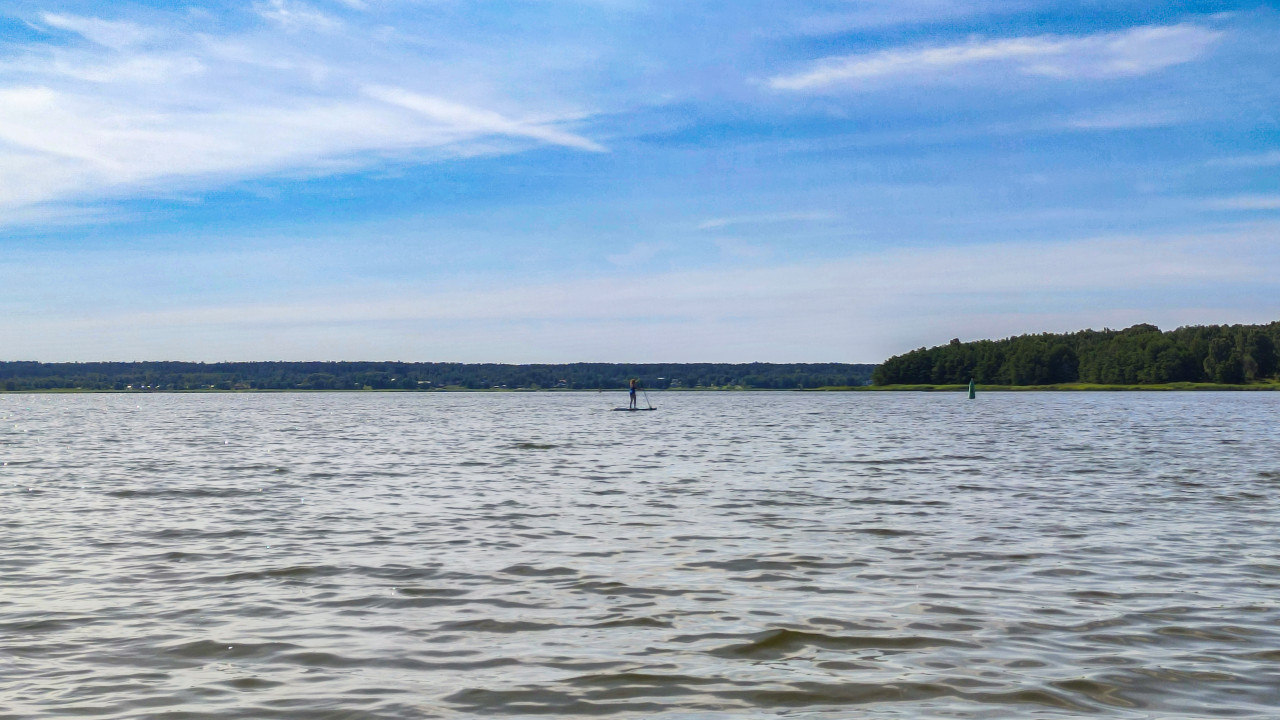 На фотографии изображен широкий водоем, где в центре кадра находится человек на сапборде, гребущий веслом. На горизонте виден лесной массив, небо ясное с облаками. Вода спокойная с легкой рябью. Сцена отражает занятие водным спортом и может использоваться для тем, связанных с активным отдыхом, туризмом и экологией.