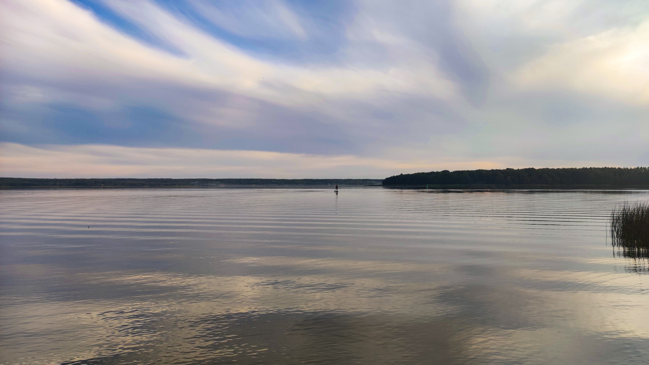 Фотография показывает спокойную гладь озера с мягкими рябями на поверхности воды. На дальнем плане просматривается вытянутый остров, покрытый лесом. Небо затянуто облаками, которые отражаются на воде, создавая плавные цветовые переходы. В центре кадра виднеется силуэт человека на доске для сапсерфинга, добавляющий динамику в спокойный пейзаж. Снимок подходит для использования в статьях о водных видах спорта, туризме и загородном отдыхе.