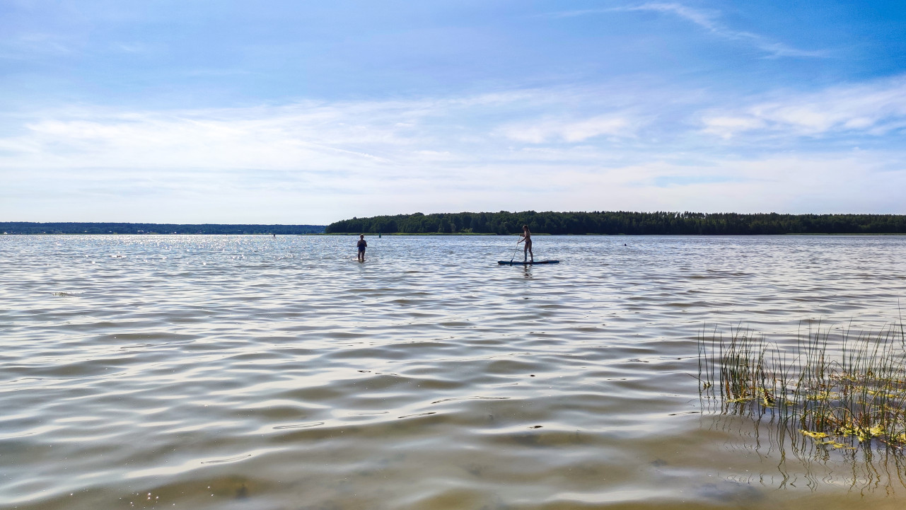 На фото запечатлены два человека в воде и человек, стоящий на сапборде с веслом. На горизонте виден лесной массив, небо частично покрыто лёгкими облаками. Вода спокойная, у правого края заметны редкие травы. Съёмка сделана днём при ясной погоде. Снимок иллюстрирует активный отдых на воде и может быть использован в материалах о спорте, туризме и летнем досуге.