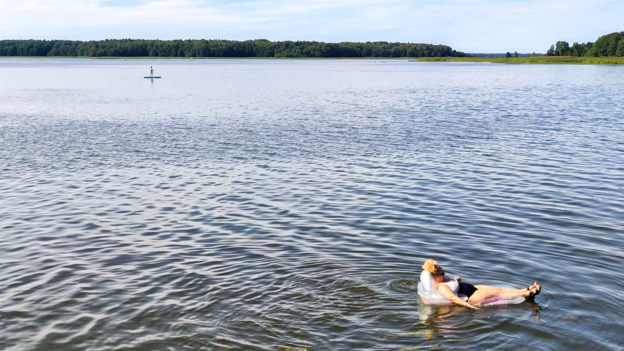На переднем плане изображена женщина в купальнике, лежащая на надувном прозрачном матрасе в воде. На горизонте виднеется человек на сапборде и лесная линия. Вода спокойная, поверхность слегка рябит, небо ясное с лёгкими облаками. Съёмка выполнена днём при солнечной погоде. Сцена отражает летний отдых у пресноводного озера и может использоваться в материалах о туризме, пляжах, досуге и отдыхе на природе.