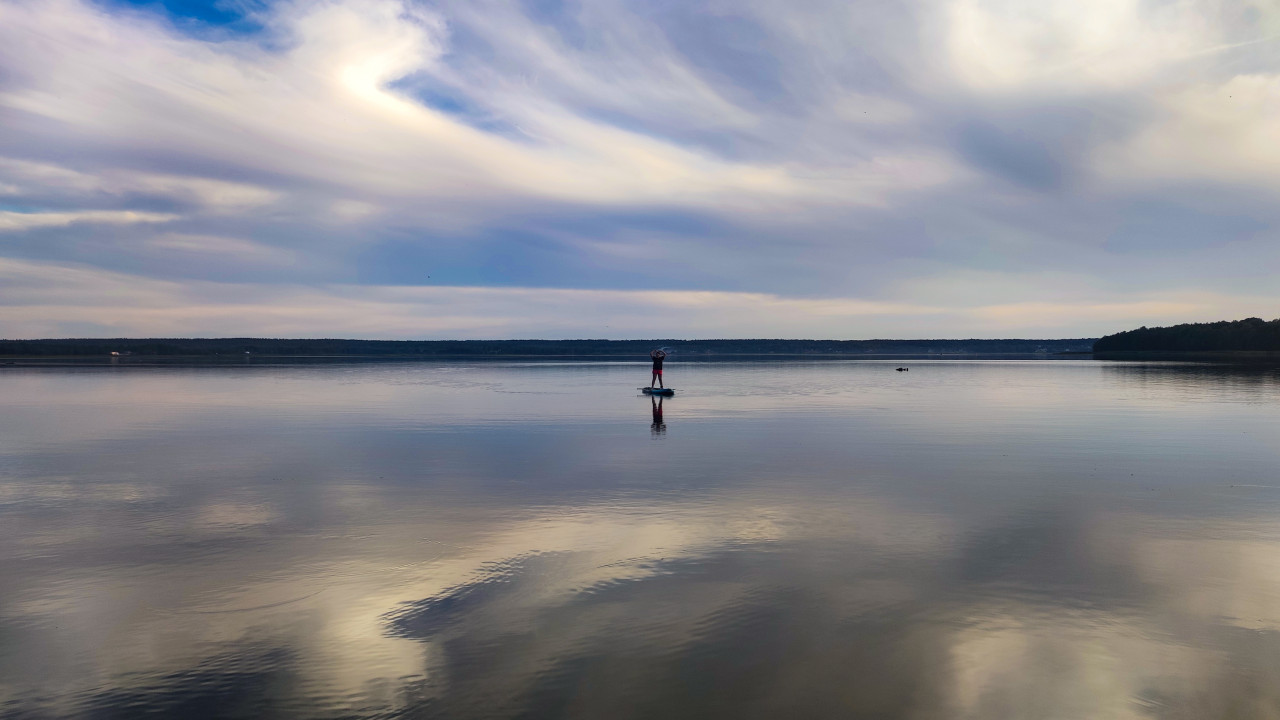 На фотографии изображен человек, стоящий на сапборде, вдалеке от берега озера. Облачное небо с полосами света отражается на гладкой поверхности воды, создавая живописный вид. Лесной массив на горизонте завершает композицию. Снимок передает атмосферу активного отдыха на природе и подходит для тематики спорта, туризма и экологического туризма.