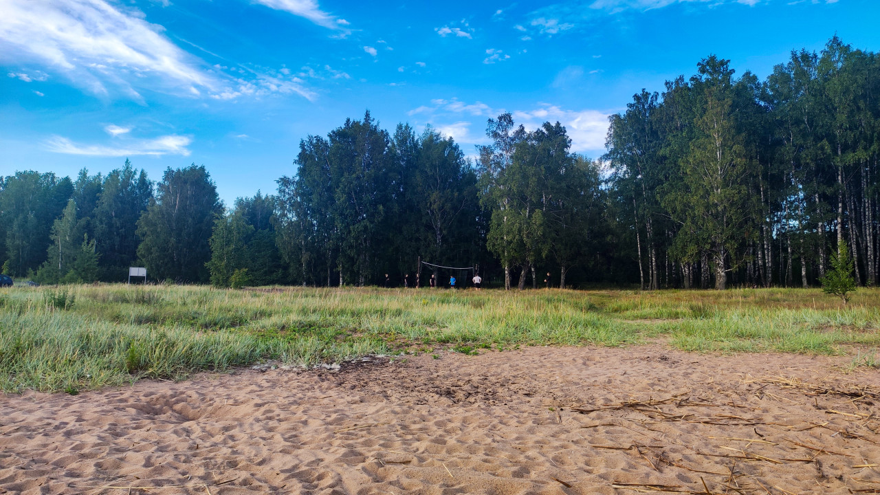 На фотографии запечатлена открытая поляна с песчаным участком на переднем плане и зеленой травой в средней части кадра. Вдали, у линии деревьев, установлена волейбольная сетка, возле которой несколько человек играют в волейбол. На заднем плане видна лесополоса из высоких лиственных и хвойных деревьев. Небо голубое с белыми облаками, погода ясная, что указывает на летнее время. На поляне также заметны отдельные машины и щит с информацией. Снимок отражает атмосферу летнего отдыха, спортивных игр на свежем воздухе и коллективного досуга.