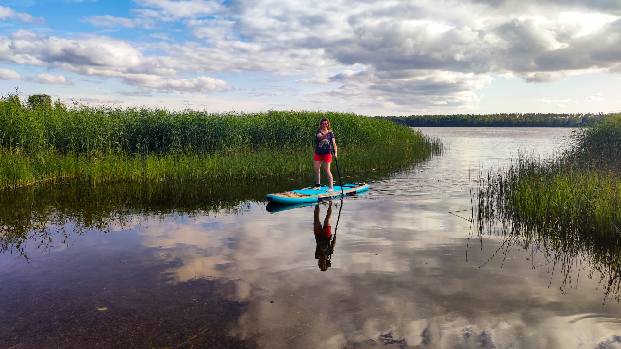 На фото изображена женщина, стоящая на сапборде и гребущая веслом на фоне зарослей тростника. Вода отражает небо с облаками, создавая симметрию в кадре. На горизонте виден лес, подчёркивающий естественный характер места. Фотография отражает тему летнего отдыха на воде и занятий спортом.
