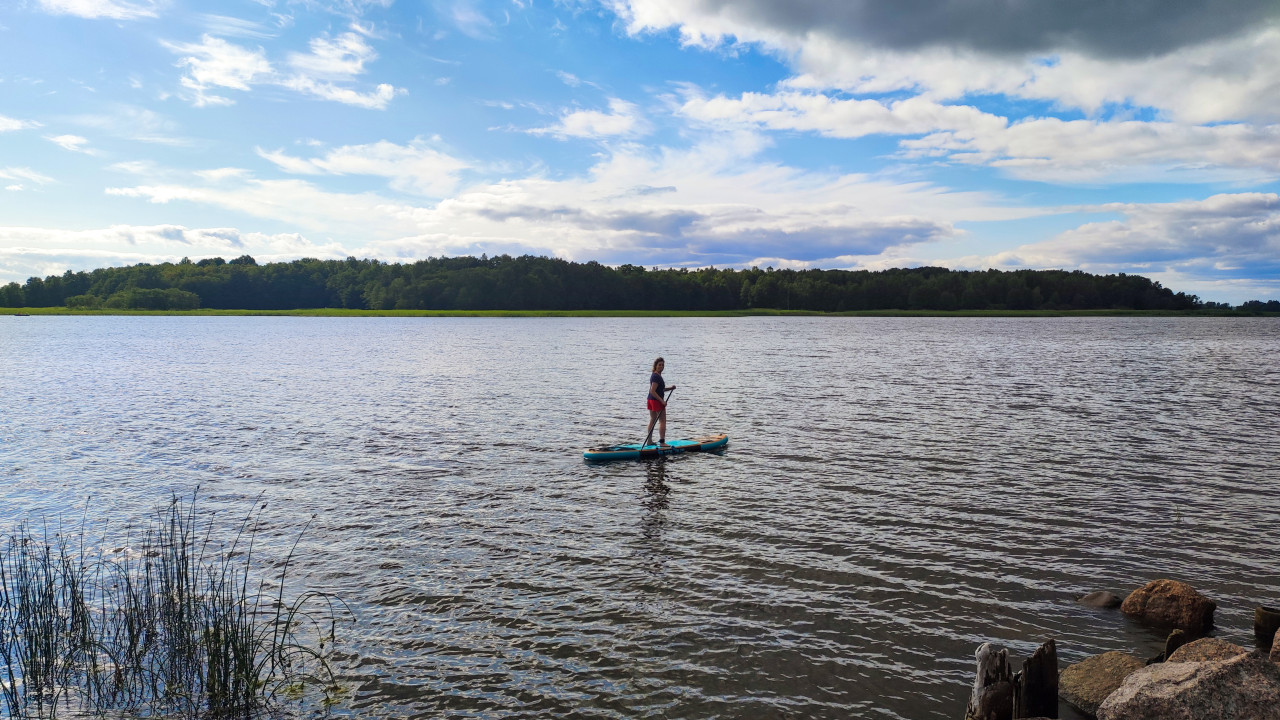 Фотография показывает женщину, стоящую на сапборде в озере недалеко от берега, где видны камни и остатки деревянных свай. Вода спокойная, небо частично закрыто облаками. На горизонте расположен лесной массив. Снимок иллюстрирует занятия водными видами спорта в естественной среде и может использоваться в темах о спорте, активном отдыхе и туризме.