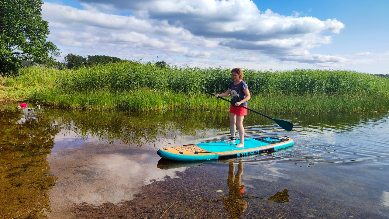 На фото изображена женщина, стоящая на сапборде с веслом в руках у самого берега озера. На заднем плане видны густые заросли тростника, а слева в кадре — зелёное дерево. Вода прозрачная, дно хорошо просматривается, а поверхность отражает облака и фигуру. На берегу заметны предметы быта, в том числе яркое красное ведро. Сцена передаёт атмосферу летнего отдыха и занятия водными видами спорта. Фотографию можно использовать для иллюстрации тем активного отдыха, спорта на воде и загородного досуга.