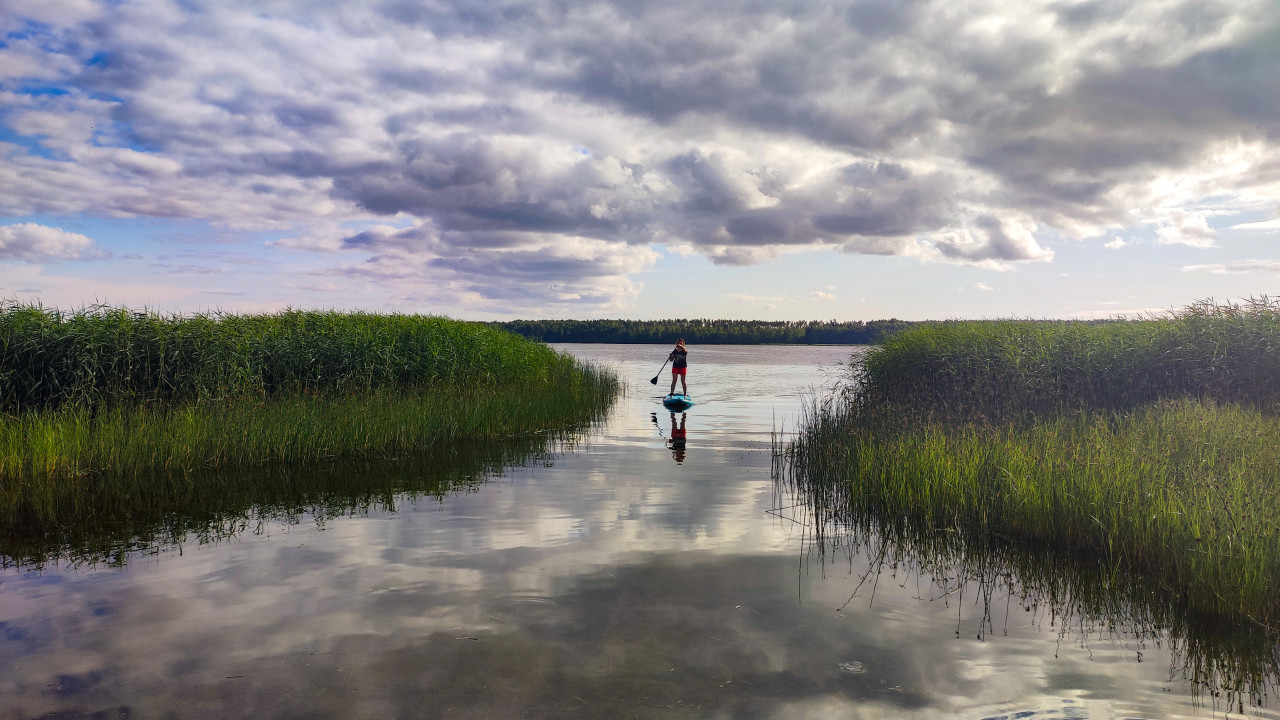 На фотографии изображена женщина, стоящая на сапборде и гребущая веслом по узкому проливу среди зарослей тростника. Вода спокойная, отражает облачное небо и фигуру. На горизонте виден лес и широкая линия озера. Сцена подчёркивает сочетание спорта и природы, подходящая для публикаций о летнем отдыхе и экотуризме.