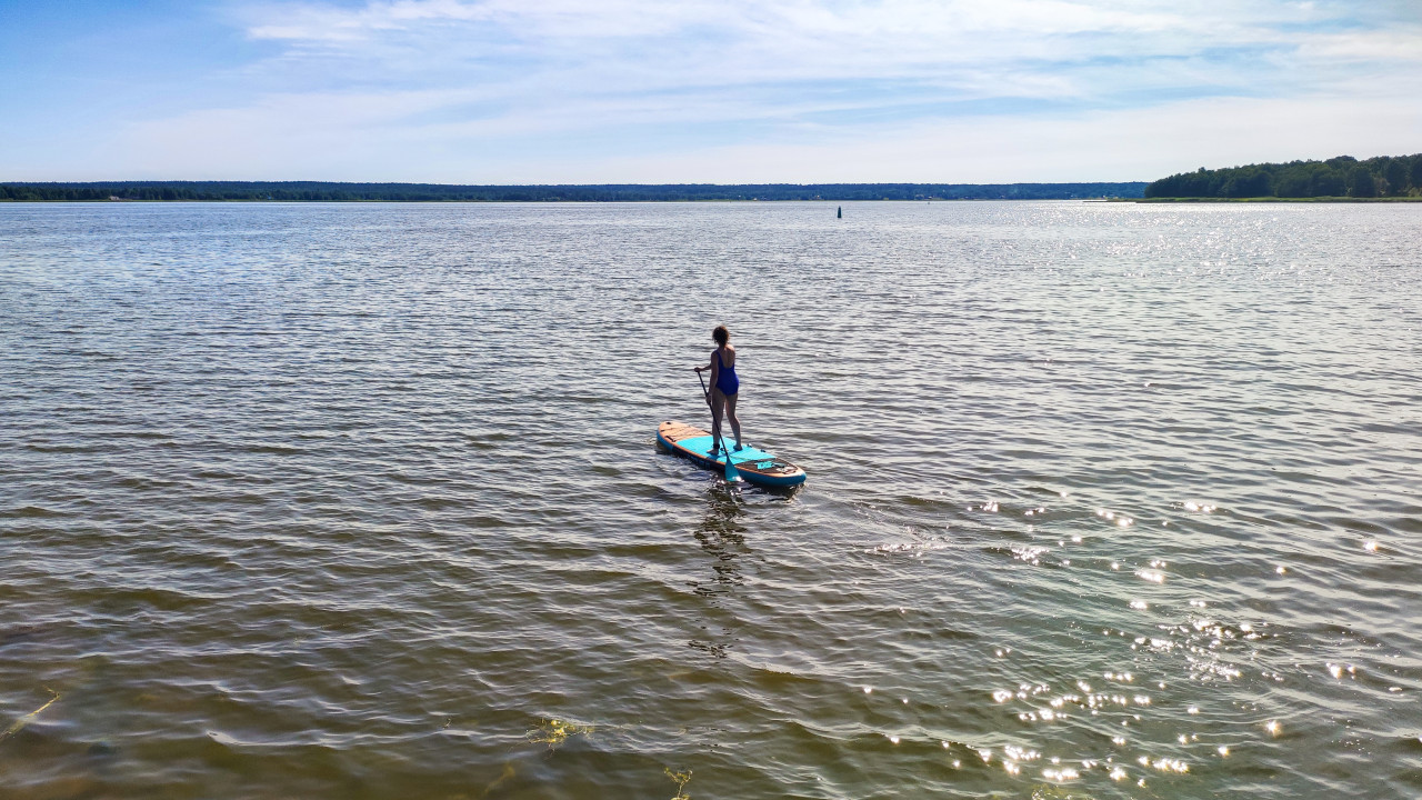 На фото изображена женщина в синем купальнике, стоящая с веслом на сапборде в центре озера. Вода спокойная, на поверхности заметны блики солнца. На горизонте видна лесная полоса и ясное небо с лёгкой облачностью. Снимок сделан днём при солнечной погоде. Изображение отражает тему активного отдыха и спорта на воде, подходит для материалов о летнем туризме, водных развлечениях и занятиях спортом на природе.