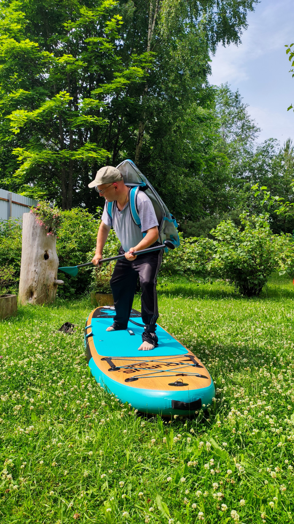 На фото изображён мужчина в светлой бейсболке, серой футболке и чёрных спортивных брюках, стоящий босиком на SUP-доске голубого и деревянного оттенка. За его спиной закреплён рюкзак, а в руках весло, направленное вниз. Сцена снята на зелёной траве среди кустарников и деревьев, что указывает на подготовку к катанию или тренировку на суше.