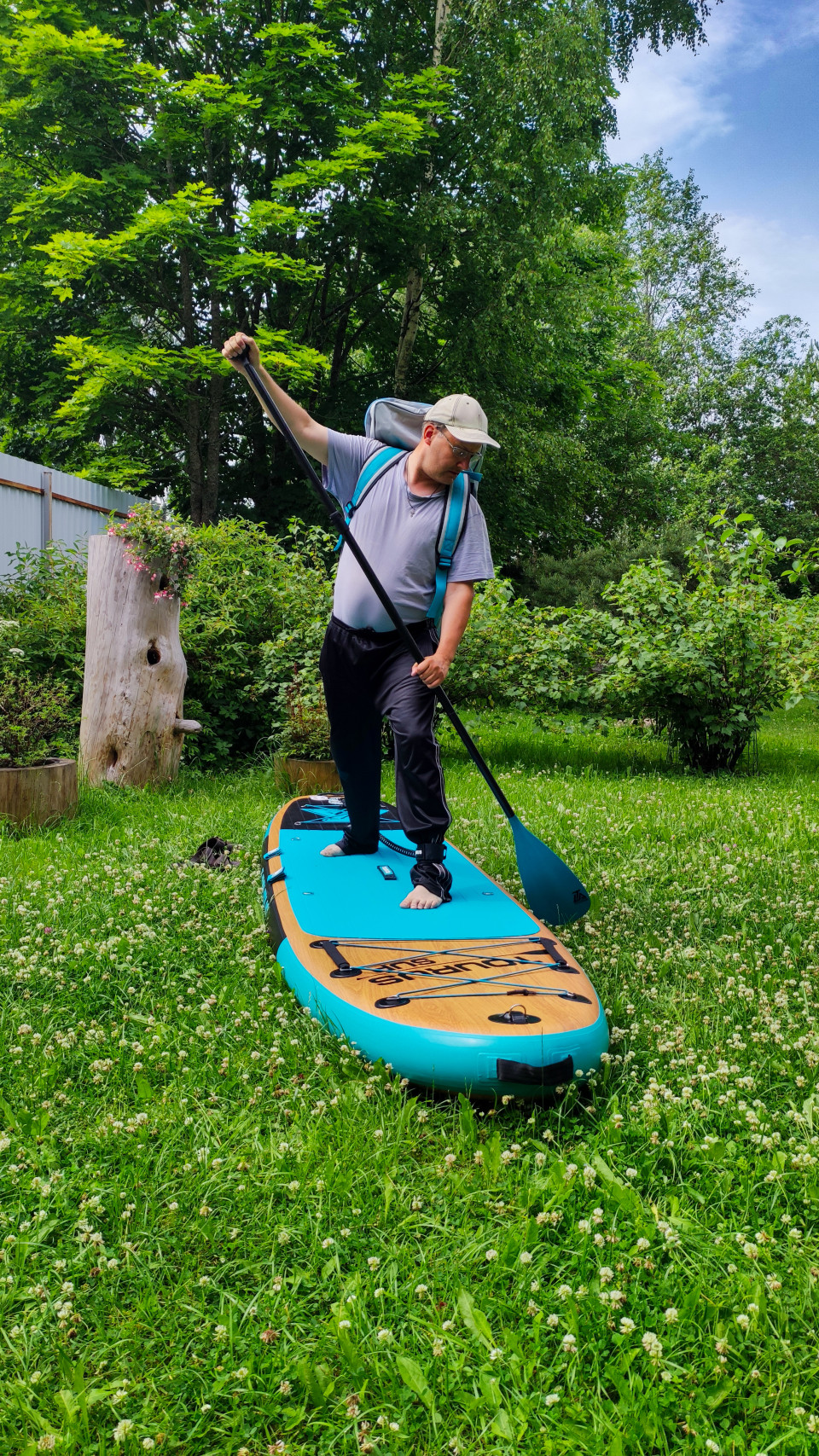 На фото мужчина среднего возраста в спортивной одежде и бейсболке, стоящий босиком на SUP-доске ярко-голубого и деревянного оттенка. В руках он держит весло, поднятое вверх и отведённое в сторону, имитируя движение гребли. За спиной рюкзак. Снимок сделан на зелёной траве с фоном из кустов и деревьев.