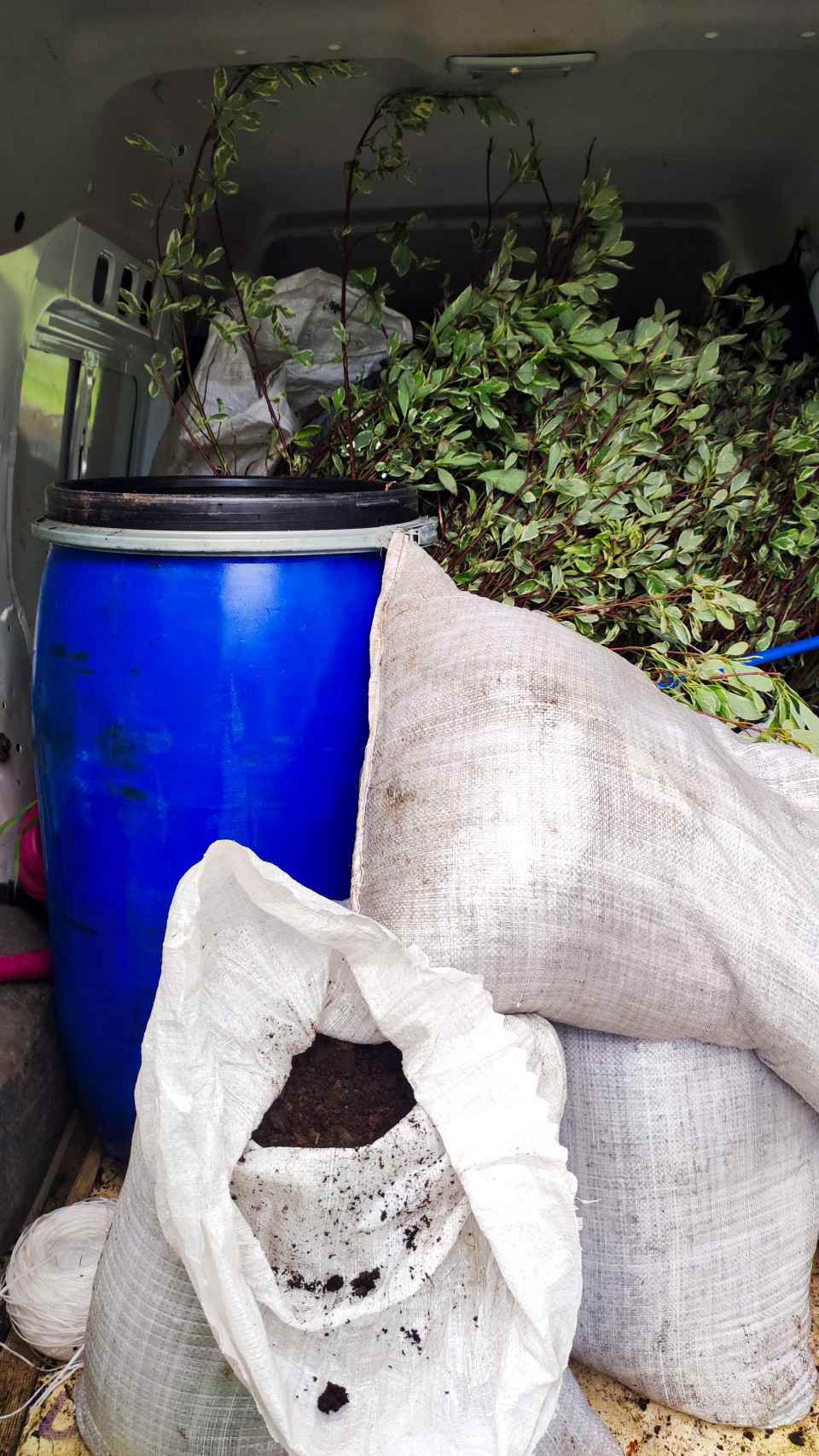 На фотографии запечатлён багажный отсек автомобиля, в котором находятся саженцы кустарников с листьями, большая пластиковая синяя бочка и несколько белых мешков, наполненных почвой. Это материалы и инвентарь для озеленения или благоустройства дворовых территорий. Снимок демонстрирует подготовительный этап работы по посадке растений в городской среде.