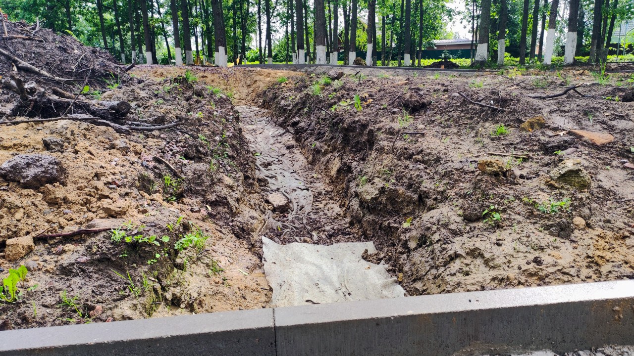 благоустройство благоустройство территории стройплощадка строительная площадка строительные работы строительство строительный участок траншея земляные работы корни деревьев грунт стройка земля коммуникации дренаж прокладка инженерные сети откосы почва траншея в земле строительный процесс инженерные коммуникации лес деревья побеленные стволы раскопки работы с грунтом прокладка каналов землеройные работыПохожие фотографии