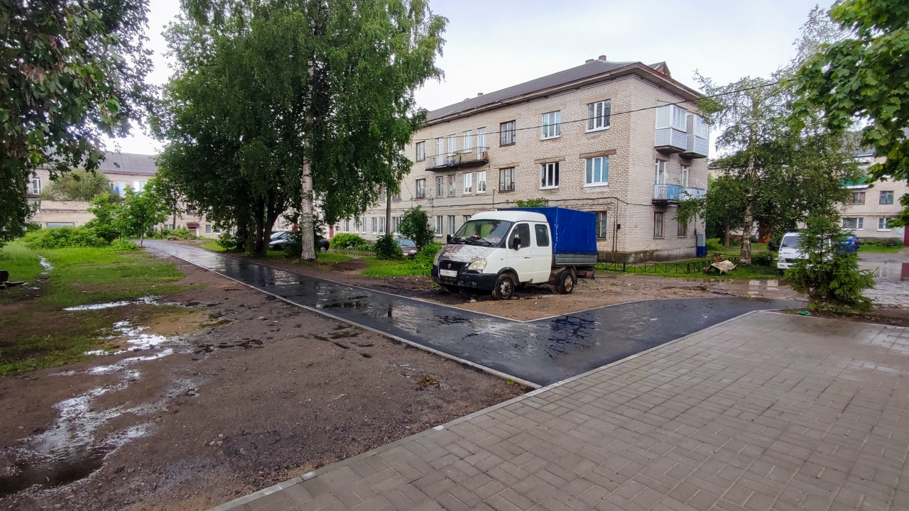 На фотографии показан двор многоквартирного кирпичного дома, где недавно проложена новая асфальтовая дорожка. Асфальт влажный от дождя, рядом видны лужи. На переднем плане припаркован небольшой грузовик с синим тентом. Вокруг дома растут деревья, а на заднем плане видны подъезды и балконы жилых зданий. Снимок может использоваться для тем благоустройства дворов, городской инфраструктуры и состояния жилых кварталов.