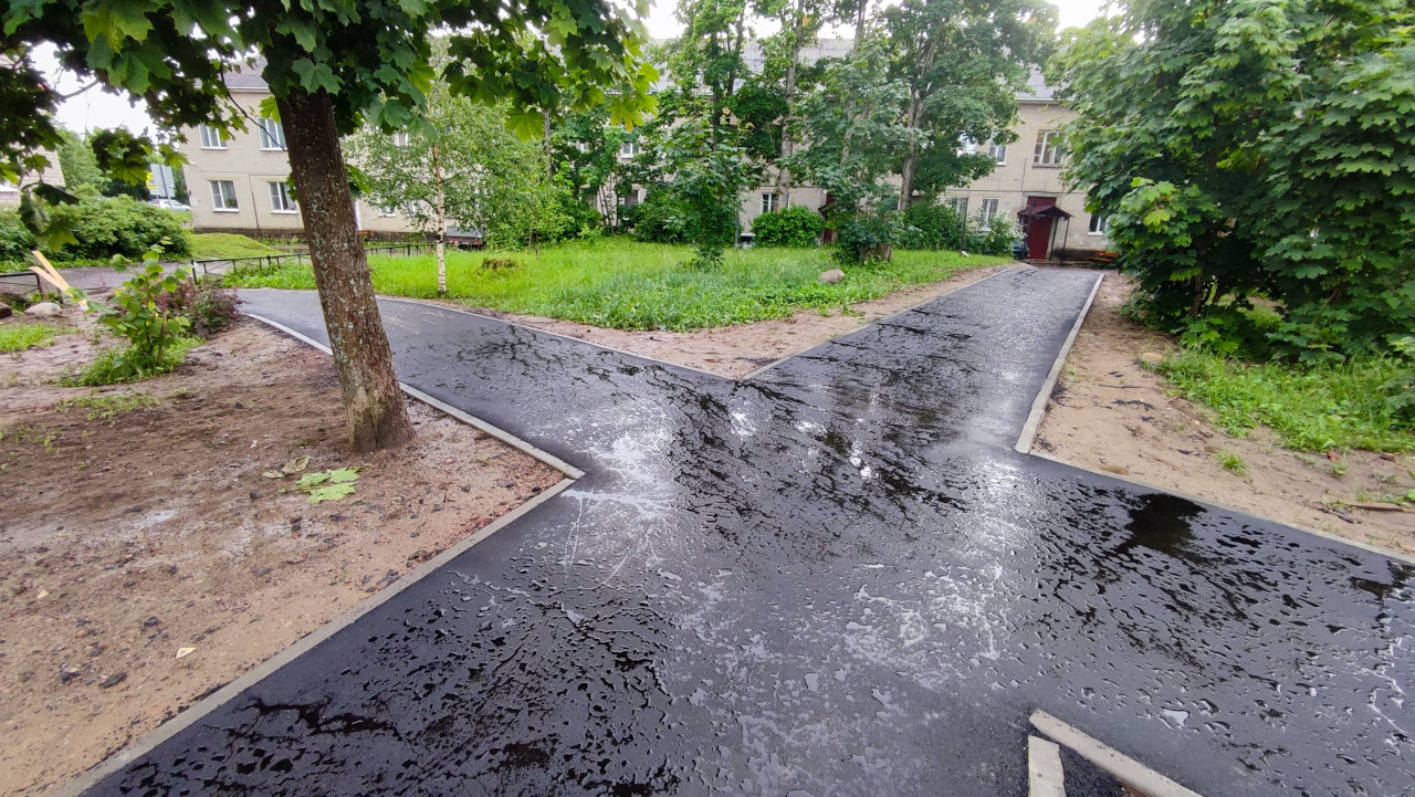 На фото изображены новые асфальтовые дорожки, уложенные во дворе жилого квартала. Поверхность асфальта мокрая после дождя, отчего видны отражения деревьев и неба. Дорожки образуют разветвлённую сеть, соединяющую разные участки двора. Вокруг дорожек растут деревья и кустарники, видны многоквартирные жилые здания. Сцена иллюстрирует благоустройство придомовой территории и улучшение городской инфраструктуры.