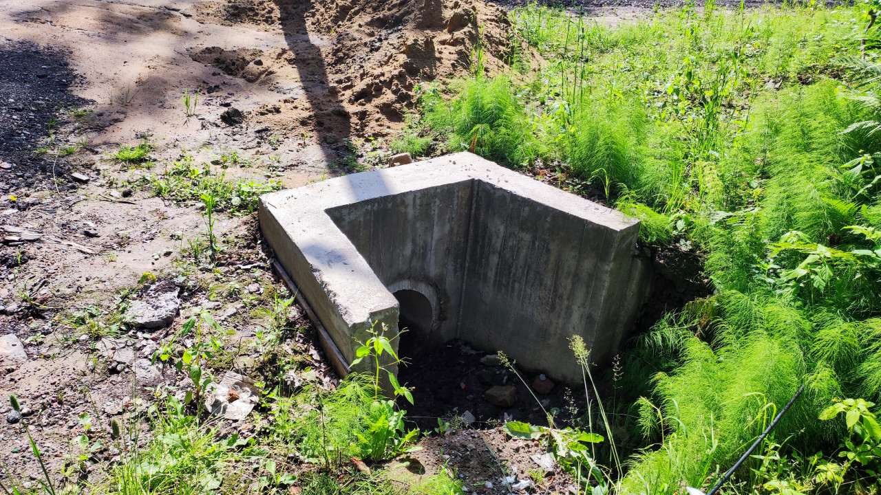 На снимке показано бетонное сооружение с круглым выходом трубы, встроенное в грунт и окружённое густой травой и растительностью. Конструкция предназначена для организации водоотвода с дорожных и тротуарных зон. На фоне заметна насыпь грунта и участок асфальтированной дороги. Фото иллюстрирует инженерное решение в рамках строительства или реконструкции дренажных систем. Изображение можно использовать в материалах о строительстве дорог, благоустройстве и инженерной инфраструктуре.