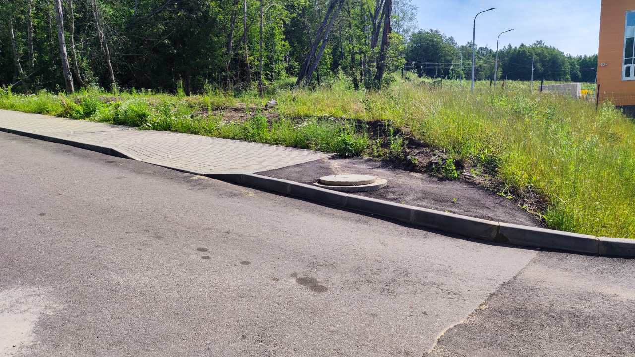 На фотографии показан участок дороги с новым асфальтовым покрытием и пешеходная зона, выложенная светлой тротуарной плиткой. По краю дороги установлен бордюр, рядом расположен люк инженерных коммуникаций. На заднем плане видна зелёная растительность и лесополоса, а справа частично попадает в кадр здание с яркой отделкой фасада. Изображение иллюстрирует благоустройство придорожной территории с элементами инженерной инфраструктуры. Фотография подходит для материалов о строительстве дорог, проектировании пешеходных зон и организации ливневой канализации.