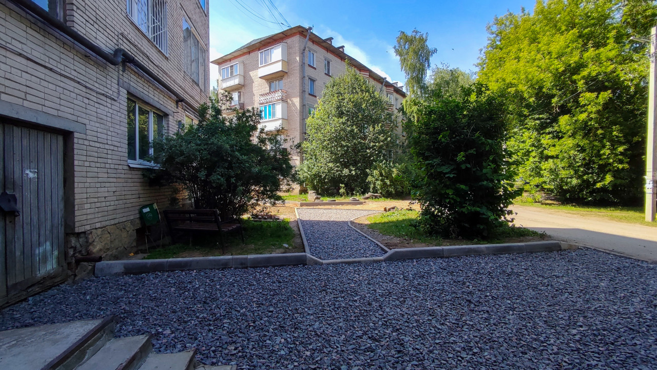 Снимок показывает внутренний двор жилого квартала, где уложена пешеходная дорожка из щебня, ограниченная бордюрным камнем. На переднем плане виден фасад кирпичного дома с окнами и металлической дверью в хозяйственное помещение. Рядом расположена лавочка и зеленые кусты. На заднем плане — другой жилой дом и зеленые деревья. Фотография отражает процесс благоустройства придомовой территории и может быть использована для иллюстрации материалов о ремонте дворов, благоустройстве, а также повседневной жизни жителей многоквартирных домов.