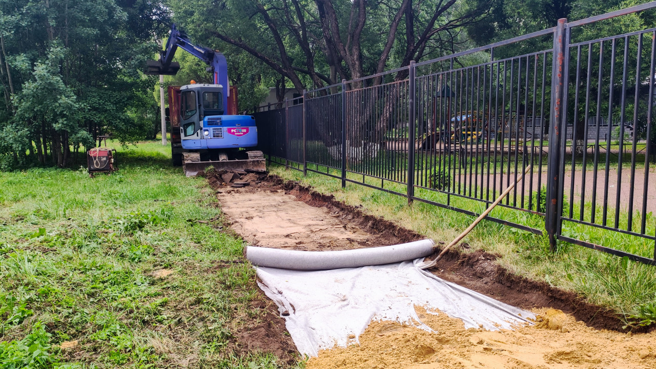 На фото изображён синий экскаватор, работающий на участке возле металлического забора. На переднем плане виден рулон геотекстиля, частично разложенный на землю, а также насыпанный песок для подушки. Вокруг растёт зелёная трава и деревья, указывающие на расположение в городской зелёной зоне. Снимок отражает этап подготовки основания при благоустройстве территории и может использоваться в материалах о строительных технологиях, ремонте дворов и применении геотекстиля.