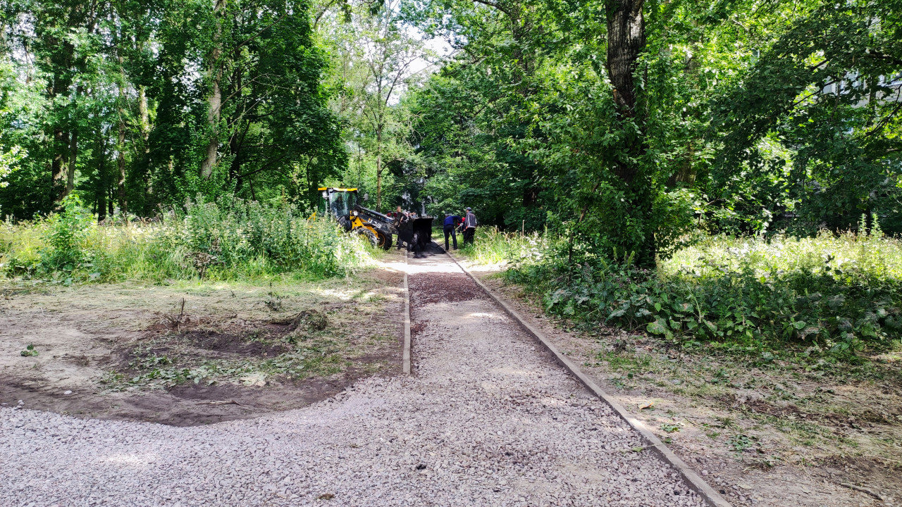 На фотографии показан участок зелёной зоны, где ведутся дорожные работы. В центре кадра видна дорожка, ограниченная деревянной опалубкой, заполненная щебнем. На заднем плане работают люди и строительная техника – трактор с ковшом, которым производится разгрузка материала. Вокруг находится густая растительность: высокие деревья, кустарники и травяной покров. Снимок демонстрирует процесс благоустройства территории и создания удобной пешеходной инфраструктуры.