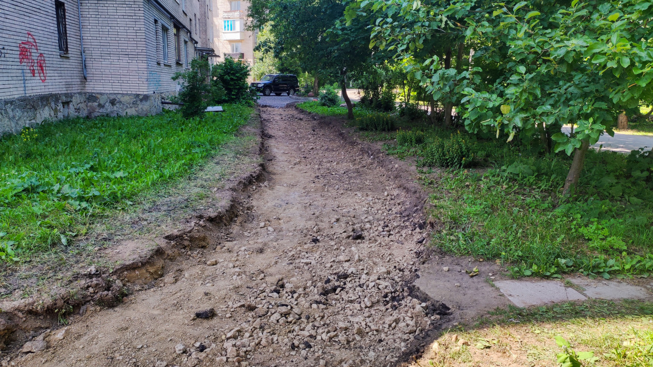 Фотография показывает участок возле жилого дома, где ведутся земляные работы. Вдоль стены здания виден вырытый грунтовый проход, подготовленный под укладку коммуникаций или асфальтирование. Справа растут деревья и кустарники, а на заднем плане заметны жилые многоэтажные здания. Фото отражает процесс благоустройства придомовой территории и может использоваться в иллюстрациях к статьям о ремонте, реконструкции и обновлении инфраструктуры жилых кварталов.