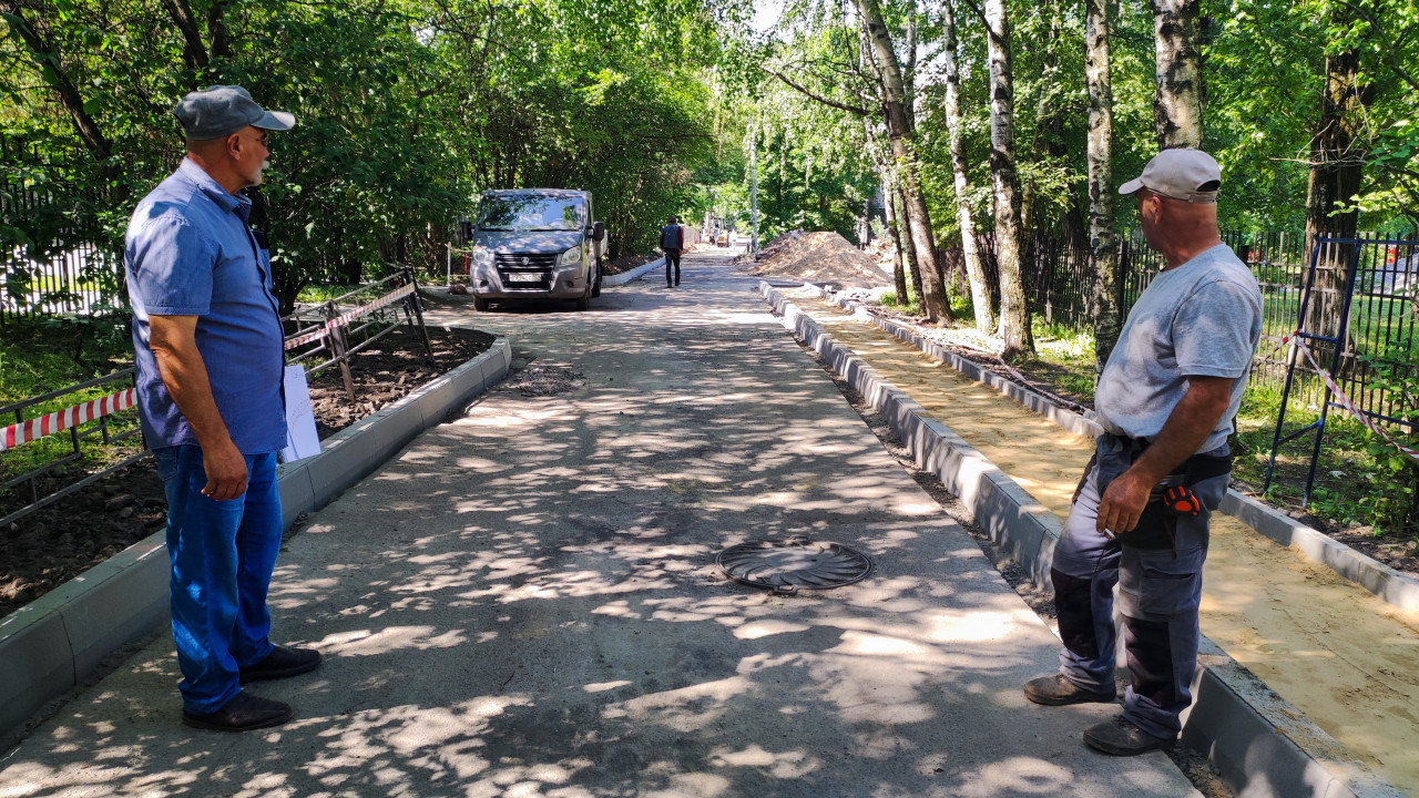 На фото изображены два человека в рабочей одежде, стоящие у дороги во дворе жилого массива. Вдоль дороги уже уложены бордюры и подготовлена песчаная основа для будущего покрытия. Вдоль тротуаров видны временные ограждения и натянутые ленты, а также куча строительного песка. На заднем плане припаркован автомобиль и продолжаются строительные работы. Снимок демонстрирует этап контроля и выполнения дорожных работ и может быть использован в материалах о благоустройстве.