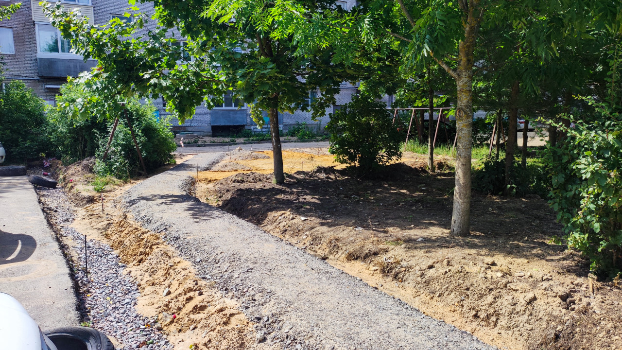 На фотографии показан процесс благоустройства двора многоквартирного дома. Видна узкая пешеходная дорожка, засыпанная щебнем и песком, по бокам вырыты неглубокие канавы. Вдоль тропинки растут деревья и кустарники, создающие тень. Слева заметна часть автомобиля и асфальтированного покрытия, справа — участок земли с насаждениями. Судя по архитектуре здания из силикатного кирпича с балконами, это типичный жилой дом советской застройки. Фото можно использовать в публикациях о благоустройстве дворов, ремонте придомовых территорий, урбанистике и строительных работах.
