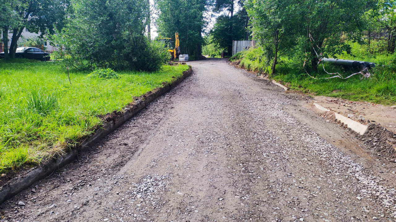 На фото изображена дворовая дорога, подготовленная к асфальтированию: поверхность покрыта щебнем, по краям установлены бордюры. Дорога идёт вдоль зелёных насаждений, вдалеке видна строительная техника. Съёмка днём при ясной погоде. Снимок отражает процесс благоустройства территории и может быть использован в материалах о ремонте дорог и городской инфраструктуре.