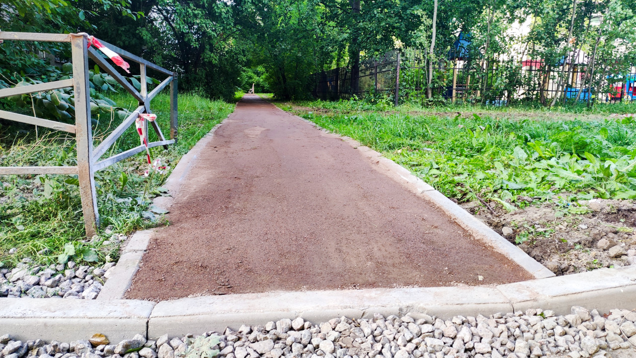 На изображении показан участок пешеходной дорожки, покрытый асфальтом, с новыми бордюрами по краям. Дорожка ведет через зеленую территорию, огороженную металлическим забором. На переднем плане видна сигнальная лента на металлической ограде, что указывает на недавнее завершение работ. Сцена отражает благоустройство дворовой территории и создание удобного пешеходного маршрута. Фотографию можно использовать в материалах о дорожном строительстве, благоустройстве жилых районов и ремонте тротуаров.