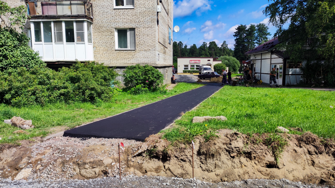 На фото изображена новая асфальтированная пешеходная дорожка, проложенная во дворе кирпичного жилого дома. Слева и справа от дорожки видна зелёная трава и кустарники. На заднем плане находятся хозяйственные постройки и люди, занятые работами. Снимок сделан днём при ясной погоде. Кадр отражает процесс благоустройства дворовой территории и может быть использован в материалах о ремонте и развитии городской среды.