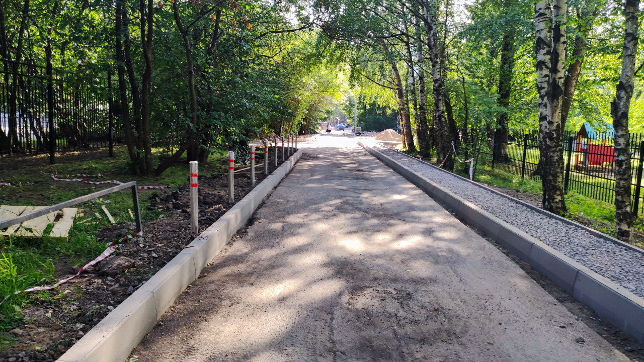 На фотографии изображен процесс благоустройства внутридворовой аллеи. Дорожное полотно очищено и выровнено, по краям установлены новые бордюры. Справа уложен слой щебня, а слева виден грунт с остатками строительных материалов и ограждение. Вдали заметны рабочие и строительная техника. Сцена демонстрирует подготовительный этап перед асфальтированием дороги. Снимок можно использовать в материалах о ремонте и реконструкции дворовых территорий и дорожных работах.