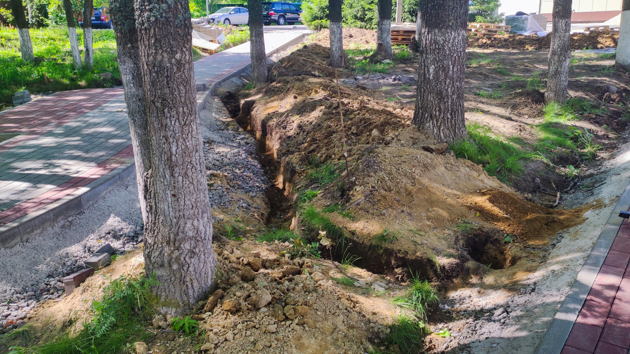 На фото изображена траншея, вырытая вдоль линии деревьев рядом с мощеной пешеходной дорожкой из тротуарной плитки. Вдоль края видны насыпи земли и строительные материалы, включая поддоны. Снимок фиксирует процесс проведения земляных работ на этапе благоустройства территории с прокладкой коммуникаций или подготовки основания под дорожное покрытие.