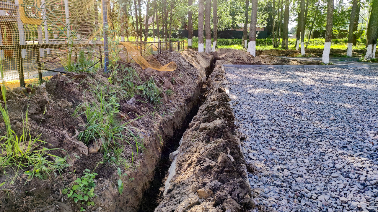 На снимке показана траншея, идущая вдоль строительной площадки, где уложен слой щебня. Слева видна металлическая ограда с натянутой защитной сеткой, а в глубине кадра — деревья с побелёнными стволами. Сцена отражает процесс устройства инженерных коммуникаций и подготовки территории к благоустройству.