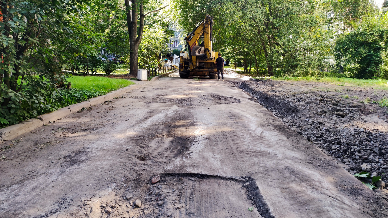На фото изображен участок дороги во дворе жилого квартала, где идет ремонт покрытия. На переднем плане видна поверхность из уплотненного грунта и остатки старого асфальта, а в глубине кадра стоит экскаватор с поднятым ковшом. Рядом с техникой находится рабочий. По обе стороны дороги расположены зеленые насаждения и бордюры. Сцена отражает этап демонтажа старого дорожного покрытия перед укладкой щебня и нового асфальта. Фотография может использоваться для иллюстрации статей и материалов о ремонте дворовых территорий, подготовке основания дорог и работе строительной техники.