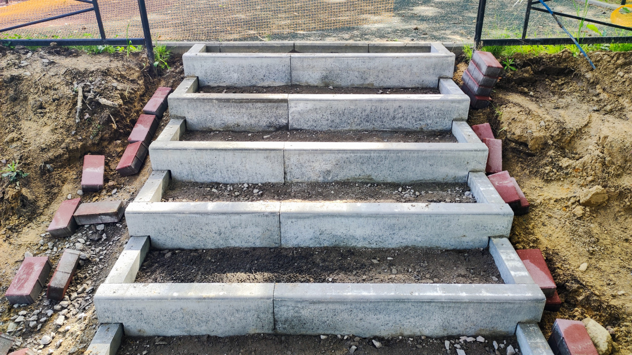 На фото изображены бетонные ступени, расположенные на склоне, находящиеся в процессе обустройства. Ступени пока заполнены землёй и мелким щебнем. По бокам видны отдельные тротуарные блоки, часть из которых лежит неустановленной. Лестница окружена земляными откосами, а сверху просматривается ограждение и защитная строительная сетка. Снимок передаёт стадию монтажа лестничного марша на открытой территории. Может применяться в статьях о ремонте и строительстве городской среды, а также в документации по благоустройству.