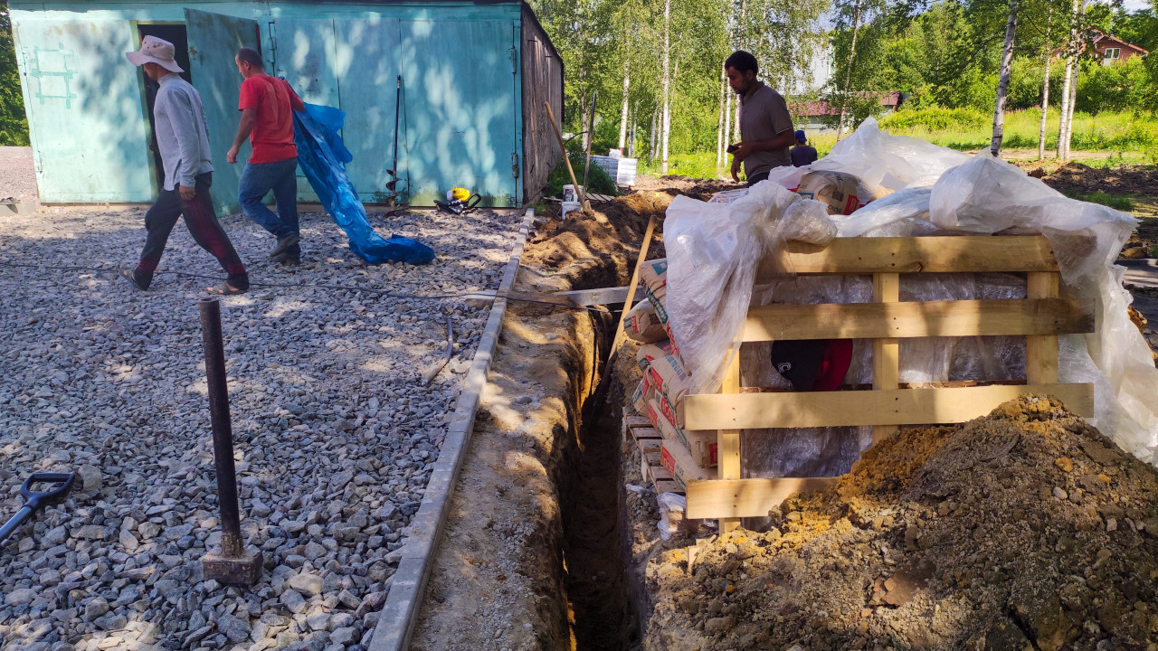 На снимке показаны рабочие, находящиеся рядом с траншеей на стройке. Рядом сложены строительные материалы в мешках и на поддонах, часть закрыта пленкой. На поверхности виден щебень, уложенный в основание будущей дорожки или площадки. Вдали виден ангарного типа объект и деревья. Снимок фиксирует этап подготовительных работ при благоустройстве или строительстве инженерных коммуникаций.
