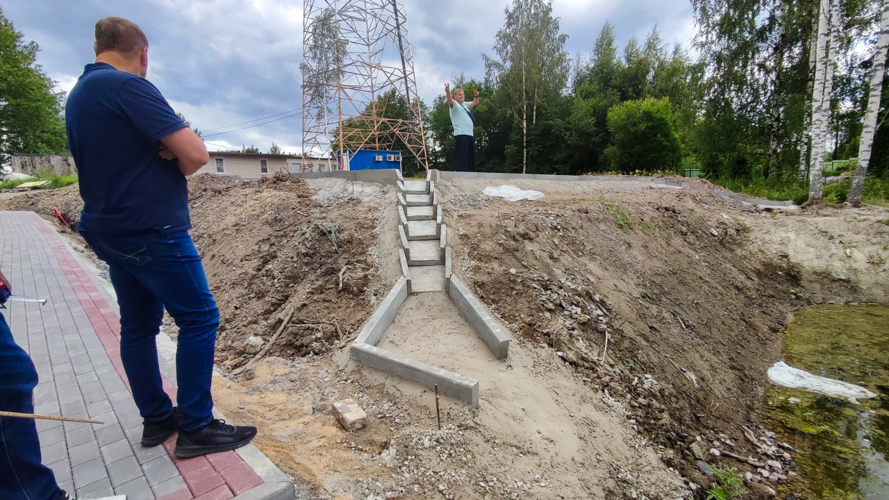 На фото изображён бетонный водоотводный лоток, проложенный по земляному склону и выходящий к пруду. Вдоль тротуара из плитки стоят двое мужчин, наблюдающих за объектом, один из них находится на верхней площадке и показывает жестами. На заднем плане заметна металлическая опора связи и хозяйственные постройки. Изображение иллюстрирует процесс строительства дренажных систем. Может быть использовано для материалов по инженерным коммуникациям и благоустройству.
