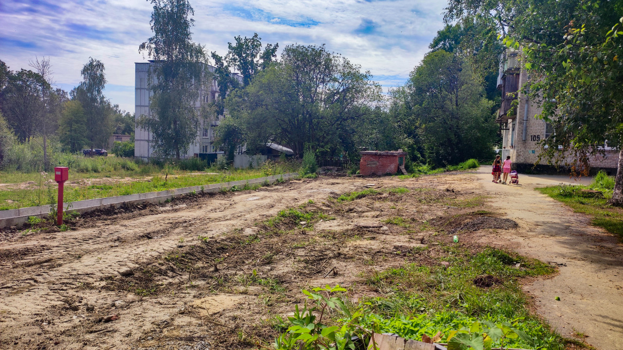 На снимке показан участок рядом с многоэтажным жилым домом, где проведены земляные работы. Территория очищена от старого покрытия, частично видны бордюрные камни. Вдали изображены деревья, кирпичная постройка и группа детей с собакой. Кадр отражает процесс благоустройства придомовой территории и подготовки площадки к дальнейшим строительным или ремонтным работам.
