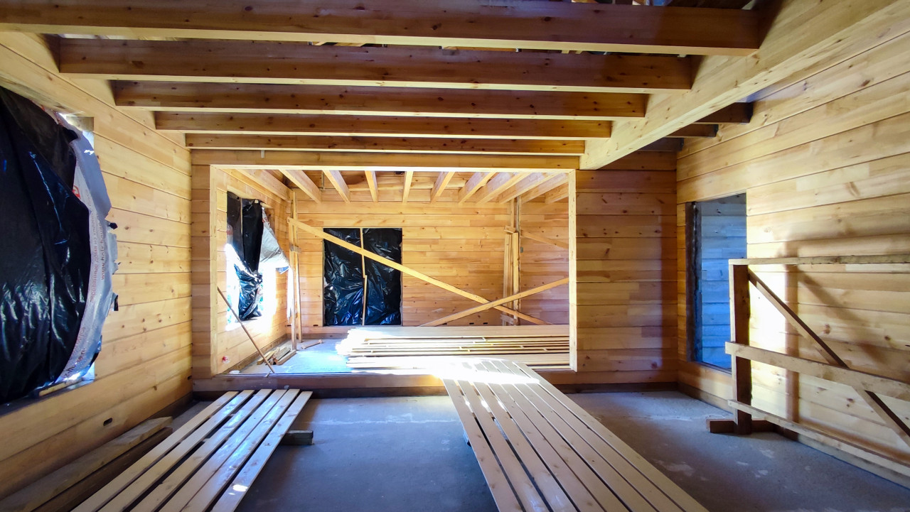 На изображении виден процесс строительства деревянного дома с акцентом на перекрытия и балки. В помещении уложены деревянные доски, которые будут использованы для будущих строительных этапов. Оконные проёмы закрыты чёрной плёнкой для защиты от влаги и ветра. В кадре можно заметить черновые строительные элементы, такие как временные распорки и балки для усиления конструкции. Фотография отражает один из ключевых этапов внутреннего устройства дома.