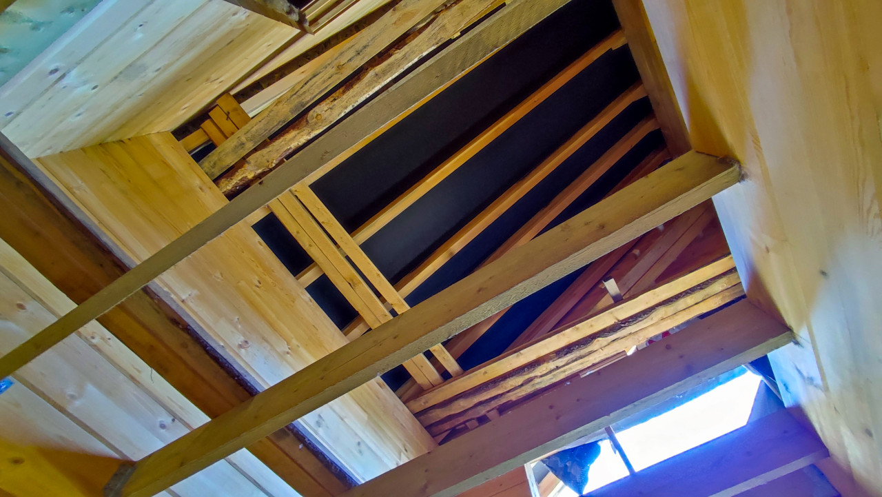 Фотография демонстрирует вид изнутри строящегося деревянного дома, где отчетливо видна стропильная система крыши. На снимке заметны балки перекрытия и элементы каркаса, выполненные из массивного дерева. Сверху виден слой чернового покрытия и свет, проникающий через оконный проем в верхней части. Снимок иллюстрирует этап строительства дома, когда кровля уже смонтирована, но внутренние работы еще не завершены. Фото может использоваться для статей о строительстве, технологиях деревянного домостроения и архитектурных решениях.