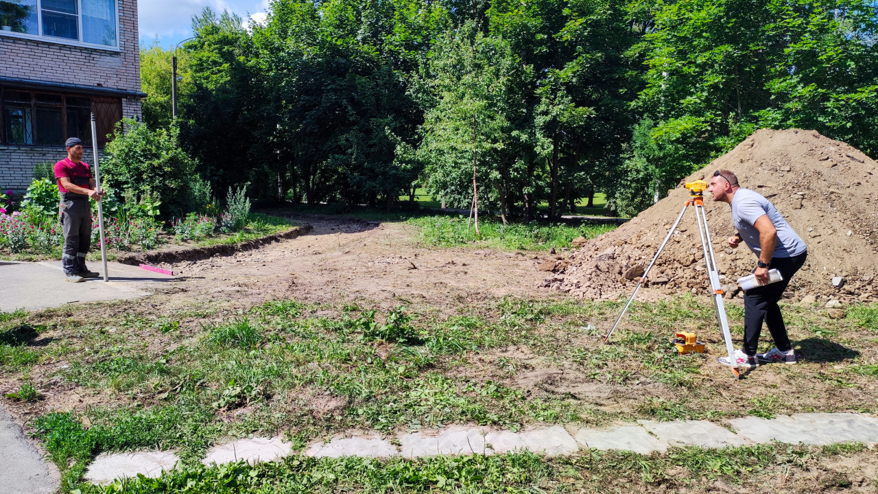 геодезия нивелир геодезист измерения оборудование инженер строительство благоустройство инженерные работы проектирование контроль качества подготовительные работы городская среда изыскания замеры двор жилой дом измерительная рейка грунт насыпь Россия многоквартирный дом кирпичный дом ЖКХ стройка оборудование на штативеПохожие фотографии