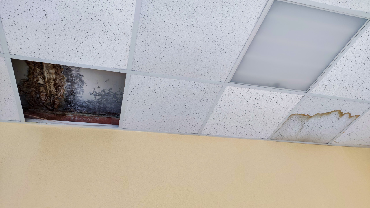 дефекты разрушение строительные дефекты техническое состояние потолок подвесной потолок панели потолочные панели поврежденные панели следы влаги протечки плесень сырость бурые пятна разводы перекрытие эксплуатация зданий дефекты помещений ремонт инженерные системы освещение светильники офис административное помещение школа аварийное состояние проблемы эксплуатацииПохожие фотографии