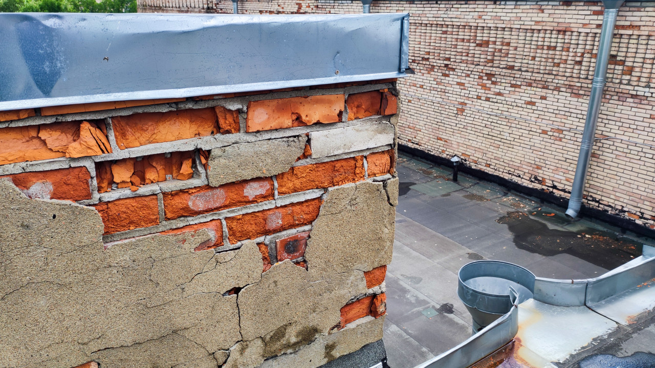 Фотография крупным планом показывает участок кирпичной стены на крыше жилого дома. На стене видны трещины, разрушения штукатурки и осыпающиеся кирпичи. Поверх установлена металлическая планка для защиты от влаги. На заднем плане заметна крыша и фасад соседнего кирпичного здания. Съемка проведена днем при переменной облачности. На изображении отсутствуют культурные или исторические объекты. Снимок можно использовать в материалах о строительных дефектах, ремонте фасадов и кровель, а также в публикациях о техническом состоянии жилого фонда.